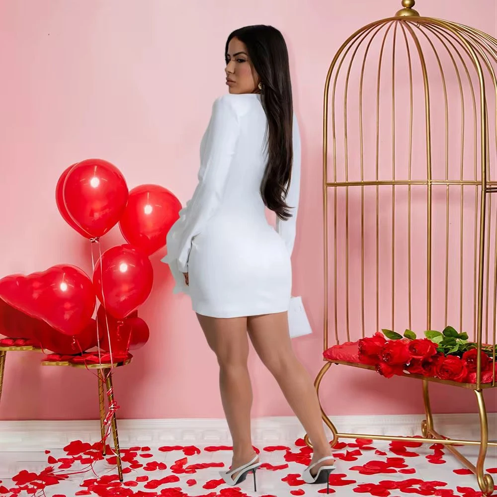 V neck mini dress hollow out long sleeve short dress for party club. White and red.